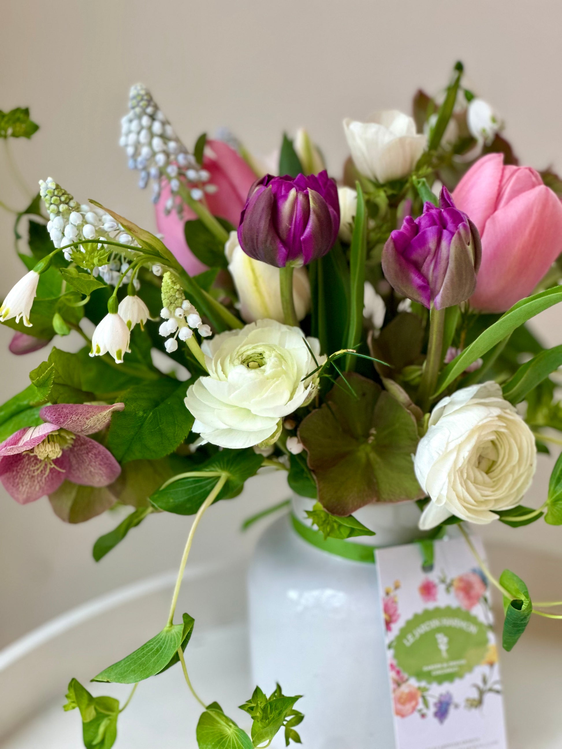 - Choose from a Wrapped Bouquet or a Vase Arrangement. Both include a mixed bouquet of 12-20 stems of the most gorgeous Spring blooms like specialty designer double peony-style tulips, heirloom narcissus, ranunculus and anemones just to name a few. Wrapped Bouquets are loosely arranged with long stems to put in your own vase. Vase Arrangements come fully arranged in a classic vase (similar to image).